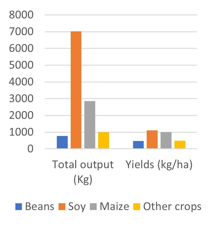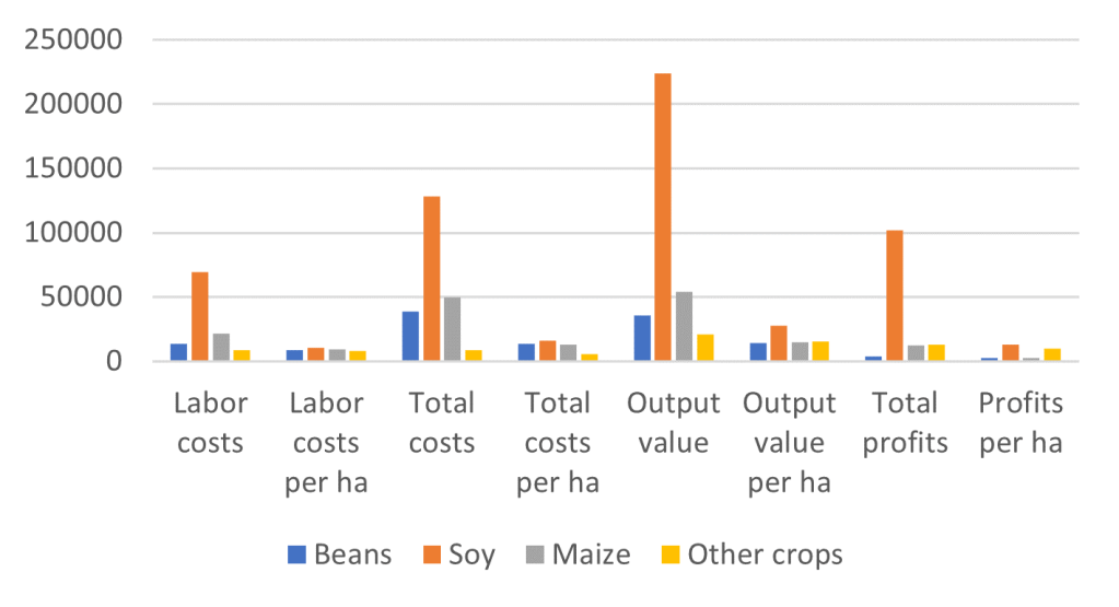 As a specific example for Mozambique, we take the case of medium-scale soy, beans and maize farmers from Gurué district, in Zambezia province, who were beneficiaries from the NGO TechnoServe, that promoted activities aimed at increasing productivity levels. We got access to a dataset for 32 farmers followed during 6 annual agricultural seasons between 2012 and 2018, and for each of their crops. All of these farmers had access to more than 5 ha combined to cultivate, but soy was the crop that was cultivated in larger plots: 64% of the cultivated soy parcels were farms with sizes between 5 to 20 ha, whereas both maize and beans were mostly planted in parcels between 2 and 5 ha. From the three crops, because of the larger sizes, soy had the larger total production, but also yields 136% greater than beans, although comparable to those for maize (only 11% greater). Soy labor costs per ha were also comparable to those for beans and maize: only 17 and 13% greater, respectively. Soy was the crop with the highest total costs per ha, and greater total output value per ha, almost doubling those for beans, maize and other crops. Hence, net profits per ha for soy were almost five times greater than those for beans and maize. In sum, soy offers greater net profits for medium-scale farmers, greater yields than beans, although comparable yields than maize, and comparable labor costs per ha than both maize and beans.